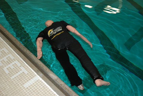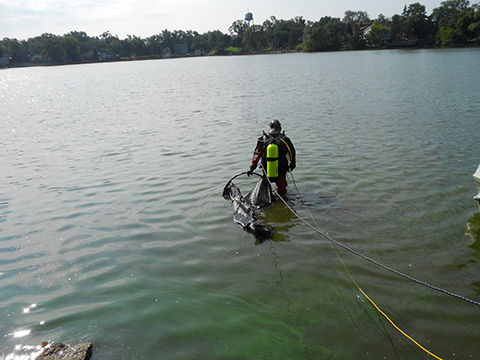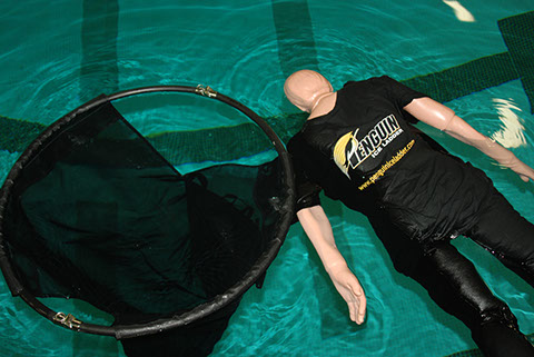 Victim at borrom with x7ix Underwater Body Bag at surface